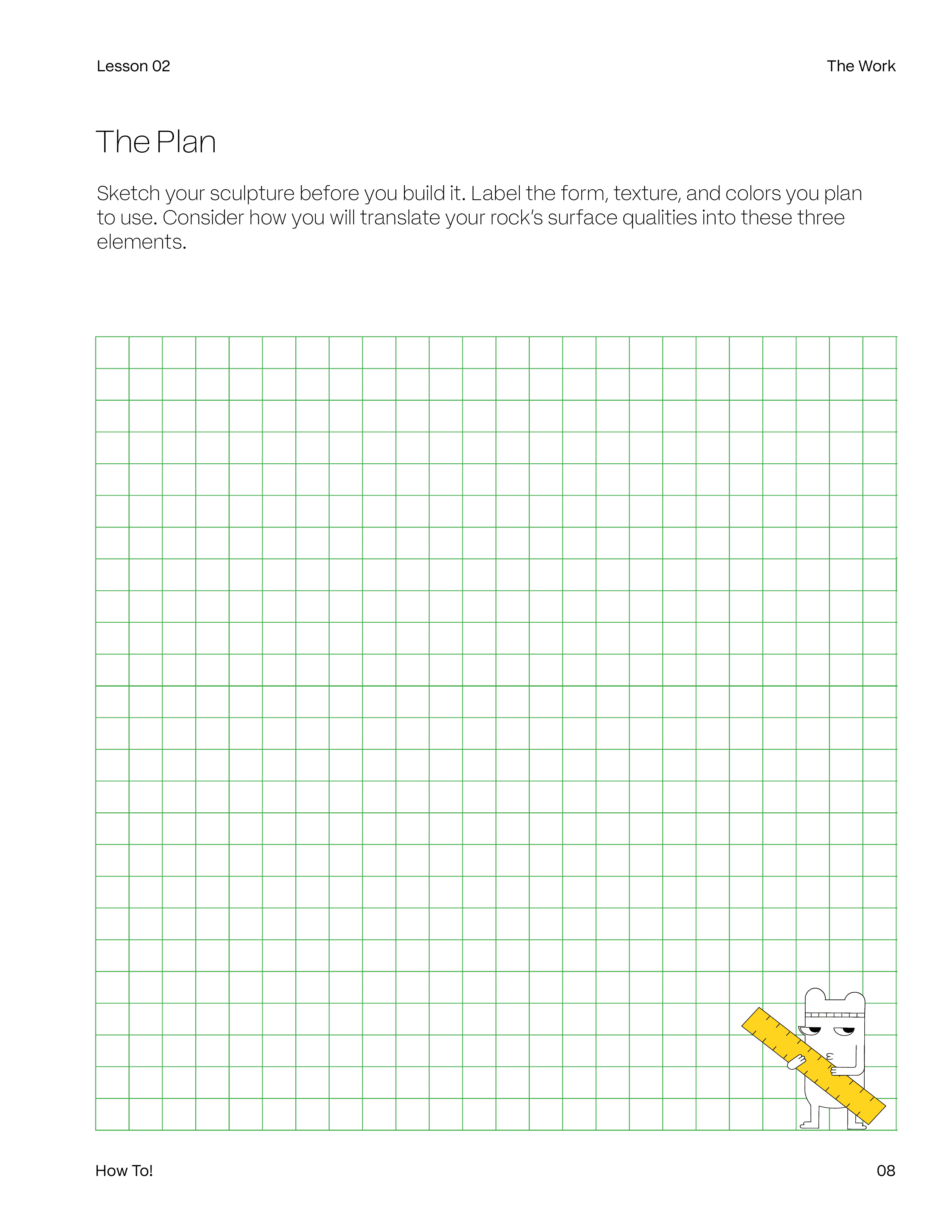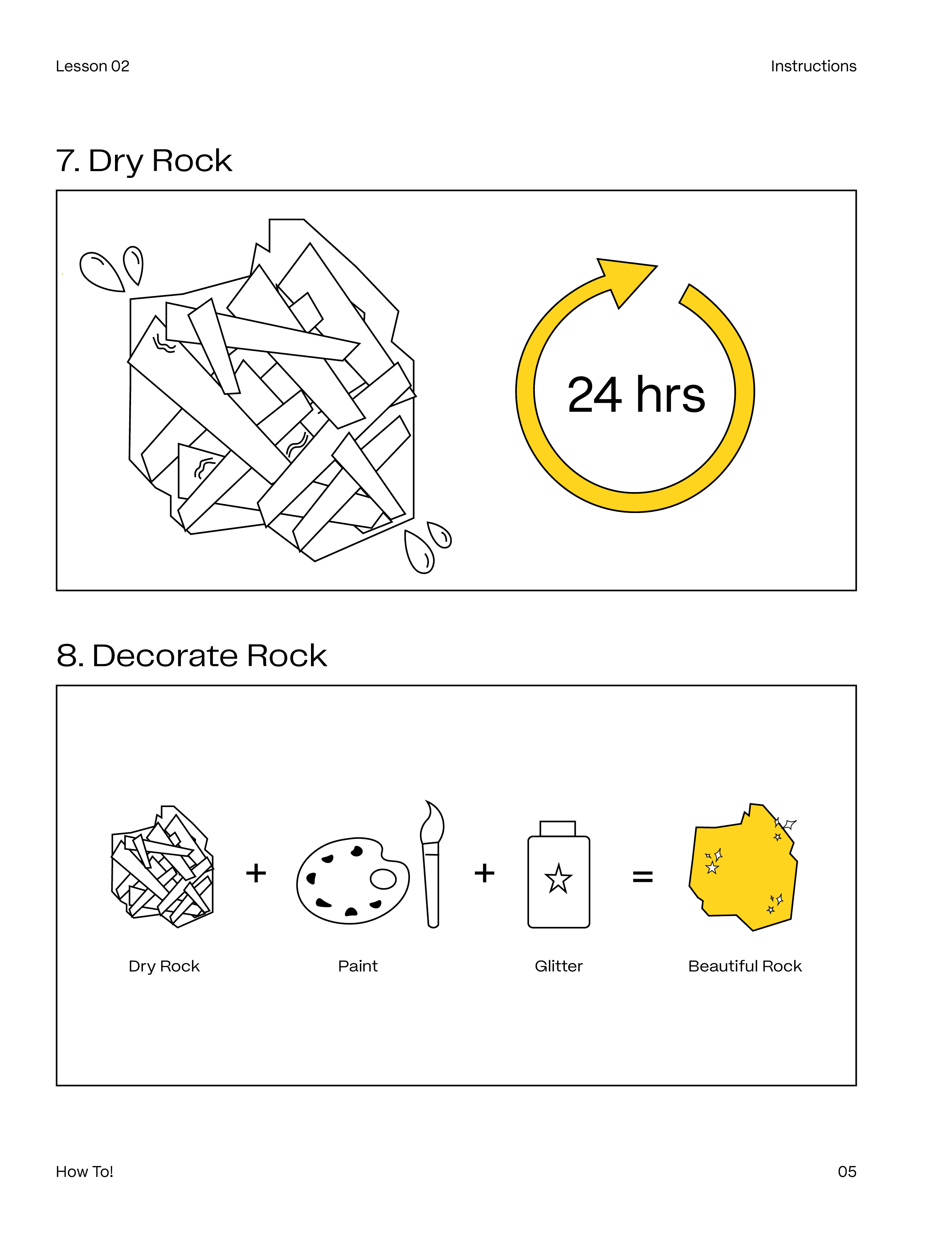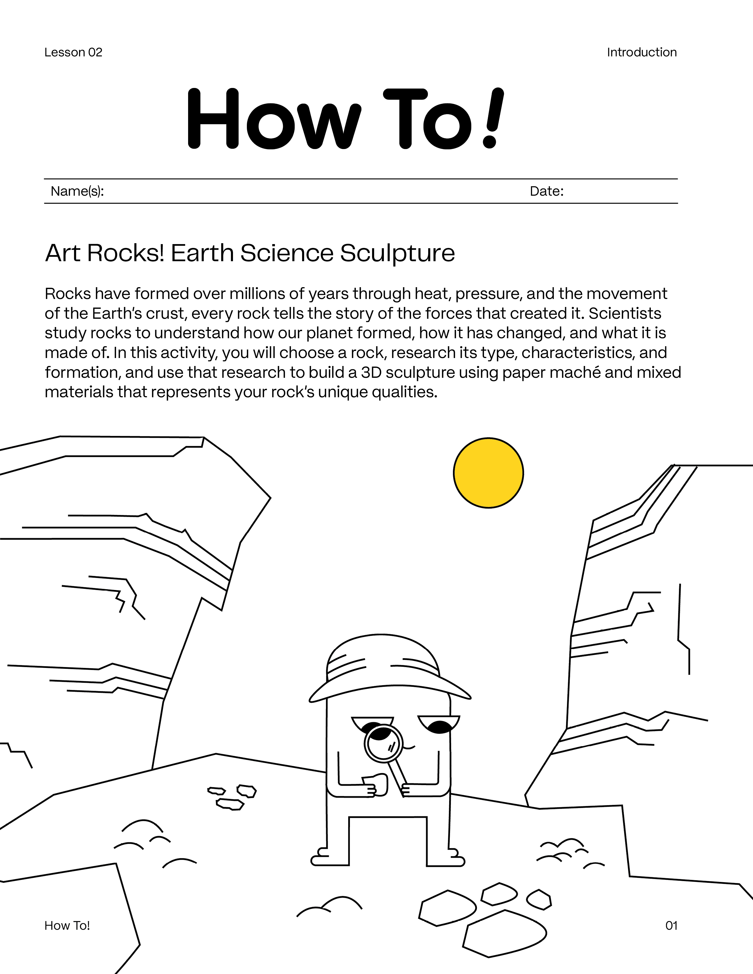 The student worksheet guides learners through researching their rock's type, luster, and composition before moving into the making process. Visual step-by-step instructions walk students through building and painting their sculpture, with a final reflection section where students document their artistic choices and connect them back to the science.